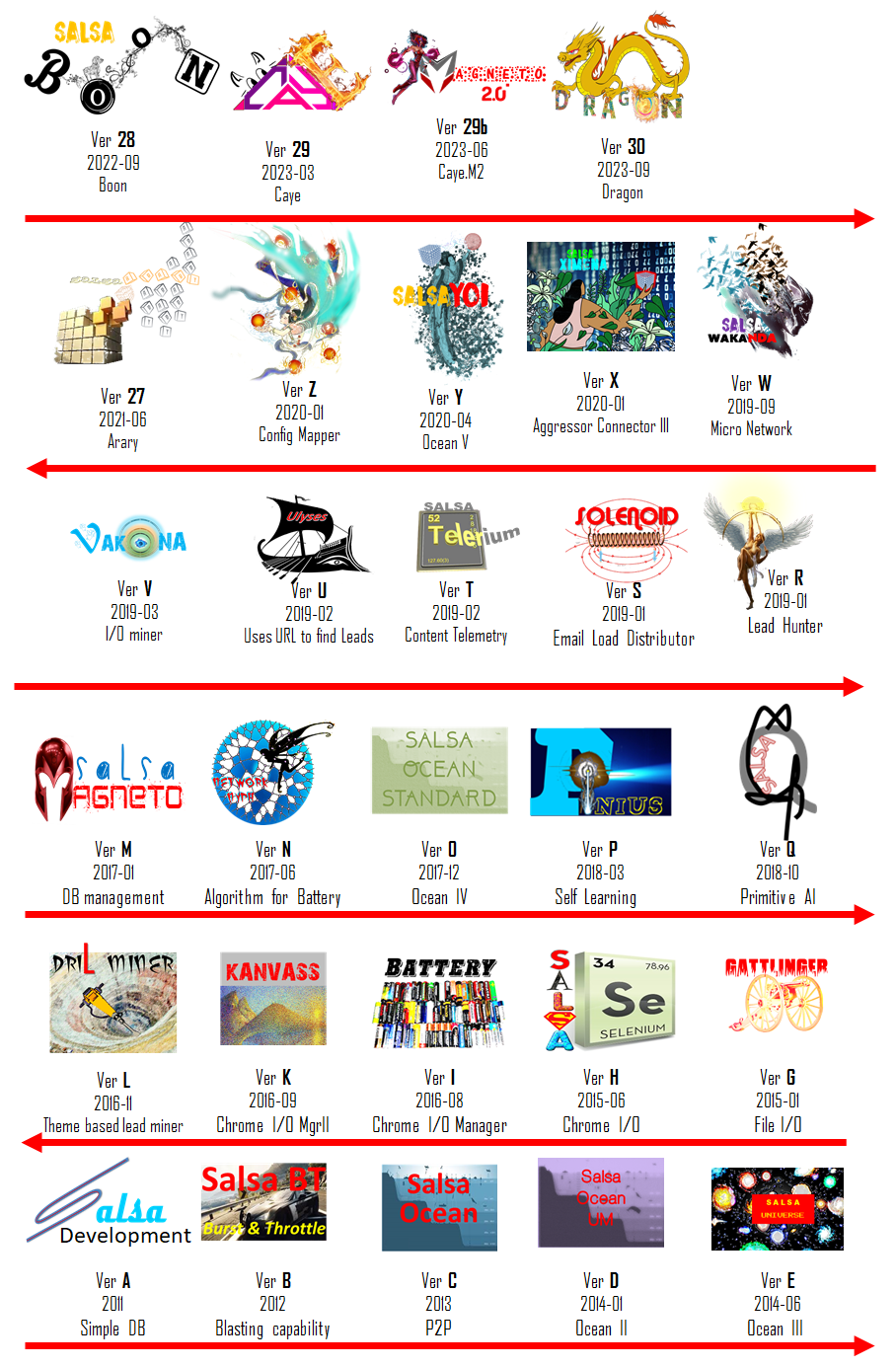 Salsa versions C,D,E,F were scrapped. The idea to accelerate the development of Salsa using, open software turned out to be a dud. It took a lot of time to understand the limitations of the open software and the complexity to integrate these software into Salsa. |